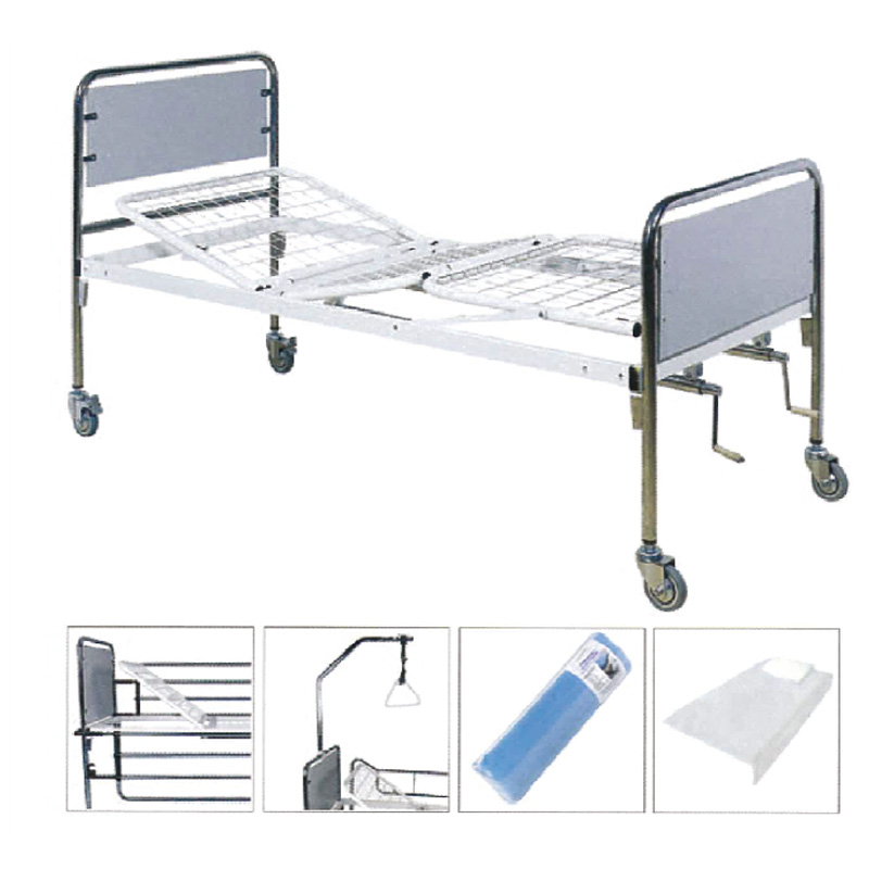 Χαρακτηριστικά: Κρεβάτι με μανιβέλα για ανύψωση της πλάτης και μανιβέλα ανύψωσης κάτω άκρων. Μεταλλική κατασκευή ακρυλικής βαφής και ξύλινα προσκέφαλα. Μπορούν να προστεθούν ρόδες με φρένα, πλαϊνά προστατευτικά πτυσσόμενα και αναρτήρας.